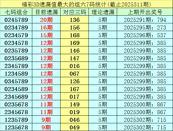 福彩3D七码遗漏组六分析(第2002001期-第2025311期)