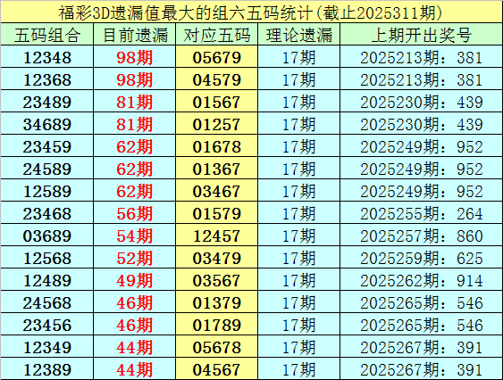 3.福彩3D第25311期10个遗漏最大的五码组六开出1个。